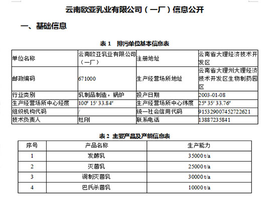 云南歐亞乳業(yè)有限公司(一廠)信息公開