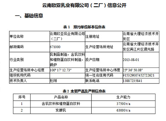 云南歐亞乳業(yè)有限公司(二廠)信息公開